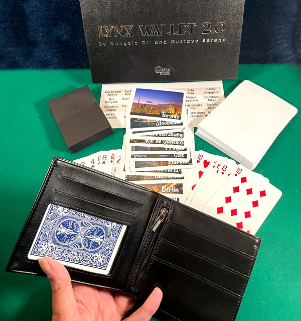 Comes with the very special leather wallet (4.5”x4” closed), a stack of gimmicked playing cards with matching black envelopes, a stack of city postcards, a word chart of cities, a stack of white envelopes, and access to video tutorials for all the routines. Manufactured by Gee Magic.