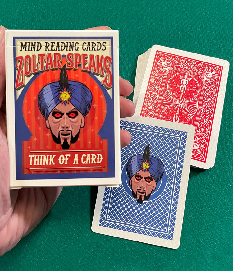 To prove Zoltar “the Svengali” knew what you were going to think of, the cards are removed from the deck, the named card is taken out and shown to be the only odd-backed card in the deck. Automatically resets for the next performance.