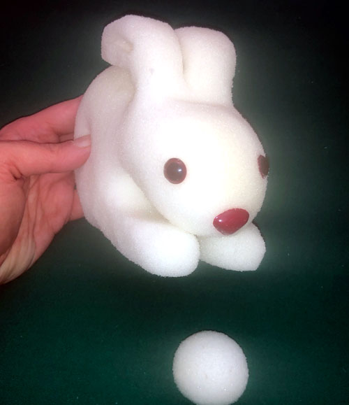 The sponge ball to rabbit trick and method is a classic of magic. The method is simple. The Rabbit has been carved in such a way so in can turn inside out to look like a ball. When the ball is then pushed into your fist it turns into a Rabbit.