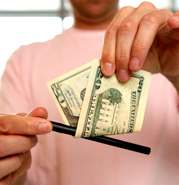 Here’s what happens: A borrowed (and even signed) bill is cleanly penetrated by a pen—right before their eyes. In the second phase, the bill is wrapped around the pen, and with no warning, it melts straight through the center. The bill is unharmed. The pen can be examined.