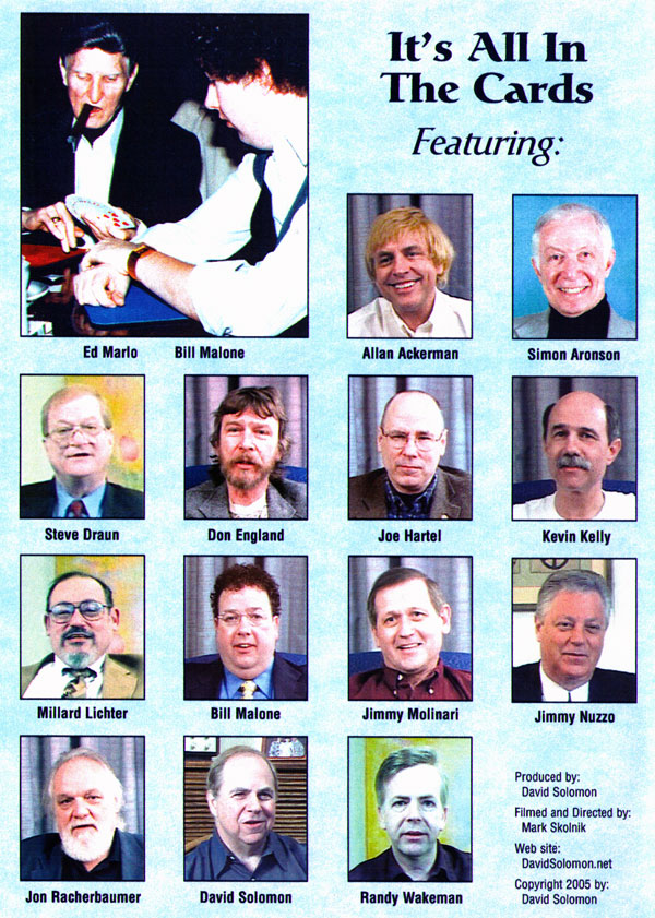 This ambitious 2-DVD set proclaims that you will get “The Inside Story of Magic's Most Prolific and Creative Card Genius.” In addition to the archival footage of Edward Marlo, Dai Vernon, and Charlie Miller the DVDs are full of interviews, performances and explanations by: Allen Ackerman, Simon Aronson, Steve Draun, Don England, Joe Hartel, Kevin Kelly, Millard Lichter, Bill Malone, Jimmy Molinari, Jimmy Nuzzo, Jon Racherbaumer, David Solomon, and Randy Wakeman.