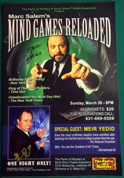 This is a beautiful 12x18 inch full color poster that was used to promote Marc Salem and Meir Yedid’s Mind Games Reloaded show that played at the Parlor Of Mystery. After the show the posters were sold to the attendees with all of the proceeds being donated to the North Shore Animal League.