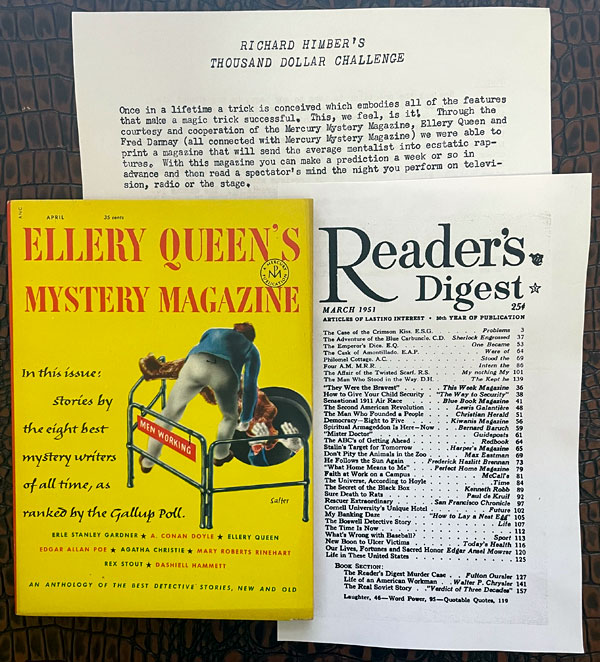 In addition to the actual magazine, he included a crib sheet you can glue on the back of a Reader’s Digest magazine which would allow you to do more mindreading feats with the Ellery Queen magazine.