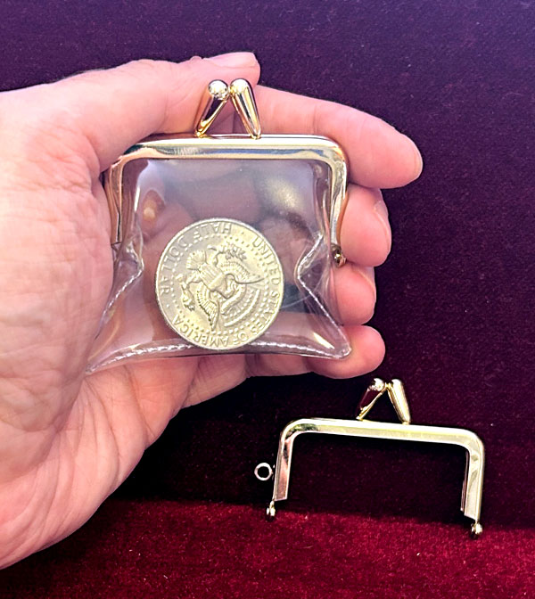 This is a custom-made clear coin purse that is made small enough to accomplish the magic that is performed in the trailer.