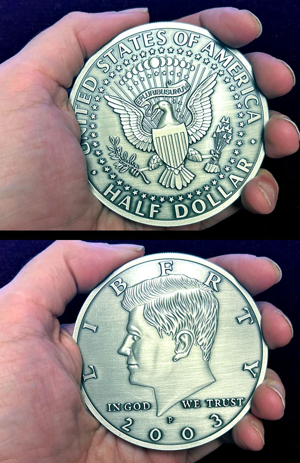 You get one Jumbo Half Dollar (3-inch diameter, 0.13-inch thickness, and weighs around 0.19lbs). No instructions. A Bacon Magic product.