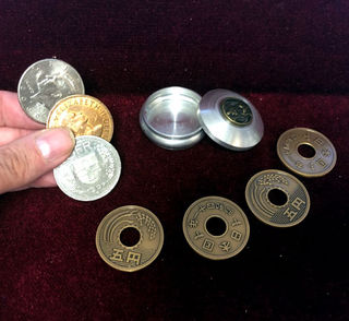 The basic routine involves a metal box which is referred to as a tiny counterfeiting machine. You dump the four coins out of the box; a Japanese coin, a Swiss coin, a British coin and a US coin. Using the Japanese coin as a sample each coin is placed in the box and one at a time, as the box is waved over the Japanese coin, the coin inside instantly turns into a duplicate of the Japanese coin. This is repeated until all four coins have turned into Japanese coins and everything is examinable.